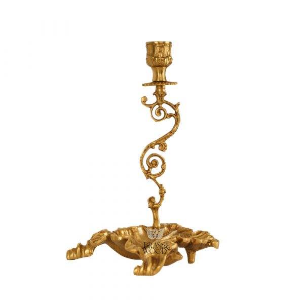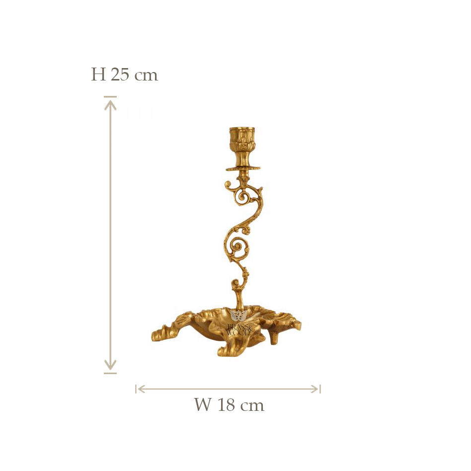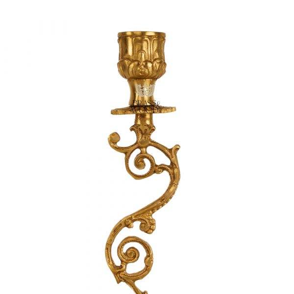 Portavelas de un solo brazo de latón antiguo con base ornamentada, detalles elegantes, diseño de inspiración vintage y lujosa decoración clásica
