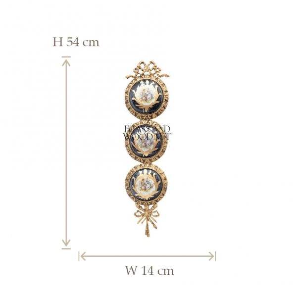 Colgante de pared de latón antiguo con tres platos de porcelana decorados con motivos florales clásicos en un marco dorado adornado