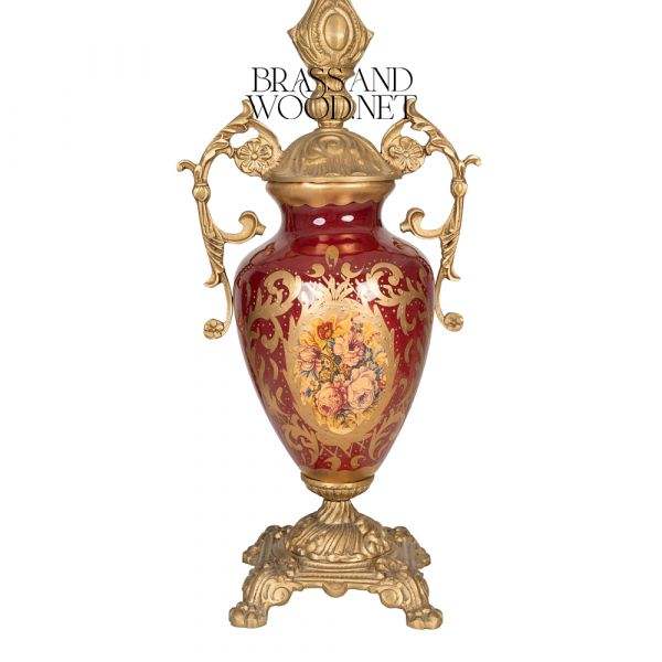 Lámpara de mesa antigua de porcelana y latón con base floral roja, asas doradas adornadas, pantalla de tela elegante y clásica