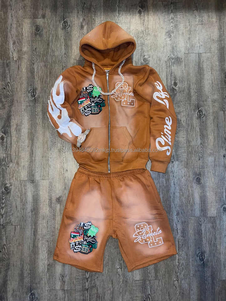 Apliques bordados parche desgastado lavado ácido Vintage multicolor 100% algodón Sudadera con capucha pantalones cortos 2 piezas Unisex verano High Street