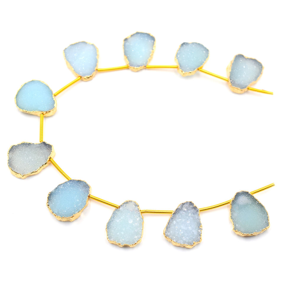 Hilo de 10 cuentas Aqua Druzy perforadas lateralmente y chapadas en oro