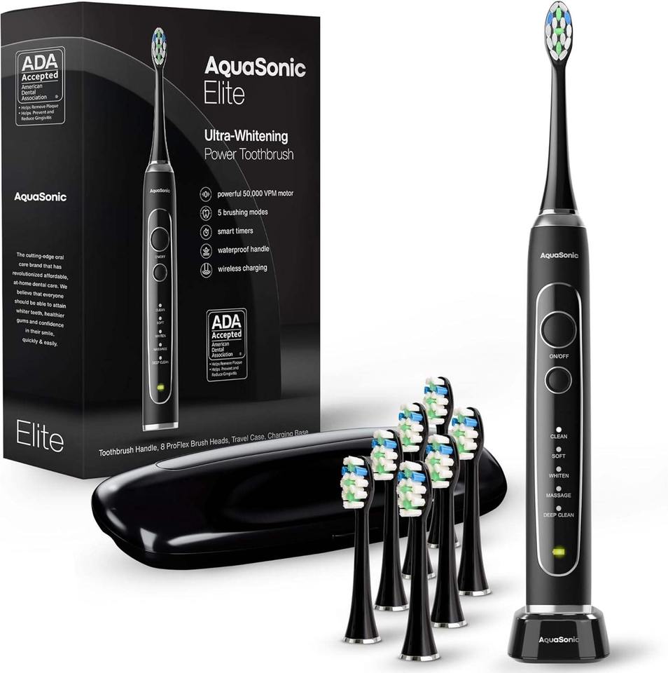 Cepillo de dientes ultra blanqueador Aquasonic Elite, cepillo de dientes eléctrico aceptado por ADA, 8 cabezales de cepillo Proflex y estuche de viaje 50.000 VPM