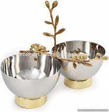 Tazón de comida de acero inoxidable de diseño árabe con asas de diseño de hojas de latón, tazones para servir frutas y aperitivos para utensilios de cocina