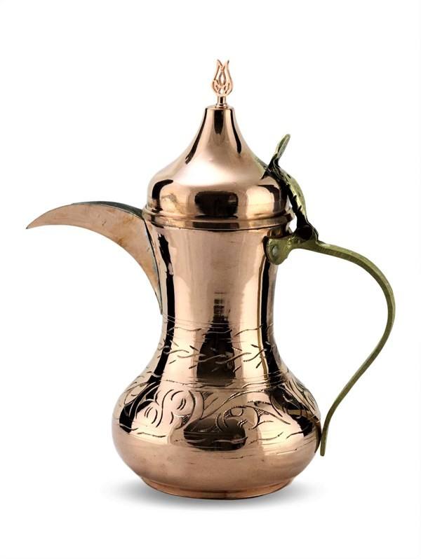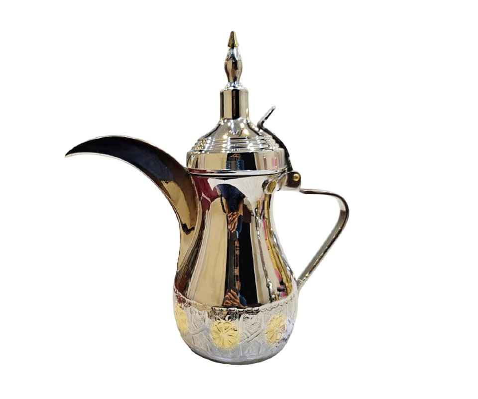 Dallah decorativa de estilo árabe con acabado personalizado en dorado para hoteles, con asa, disponible a un precio económico.