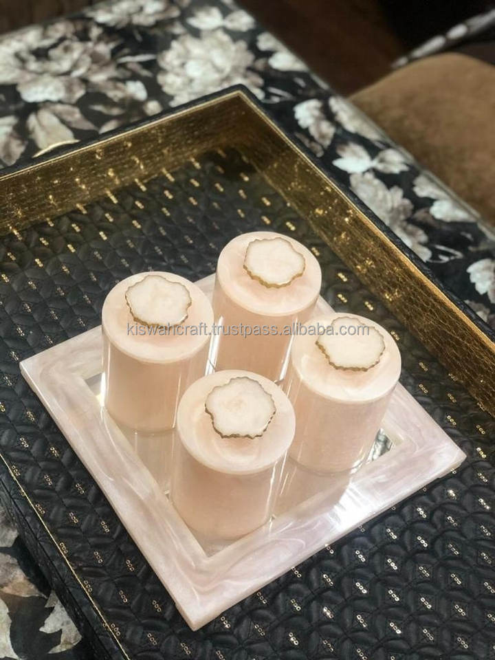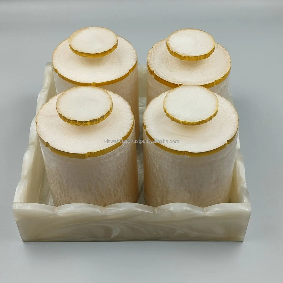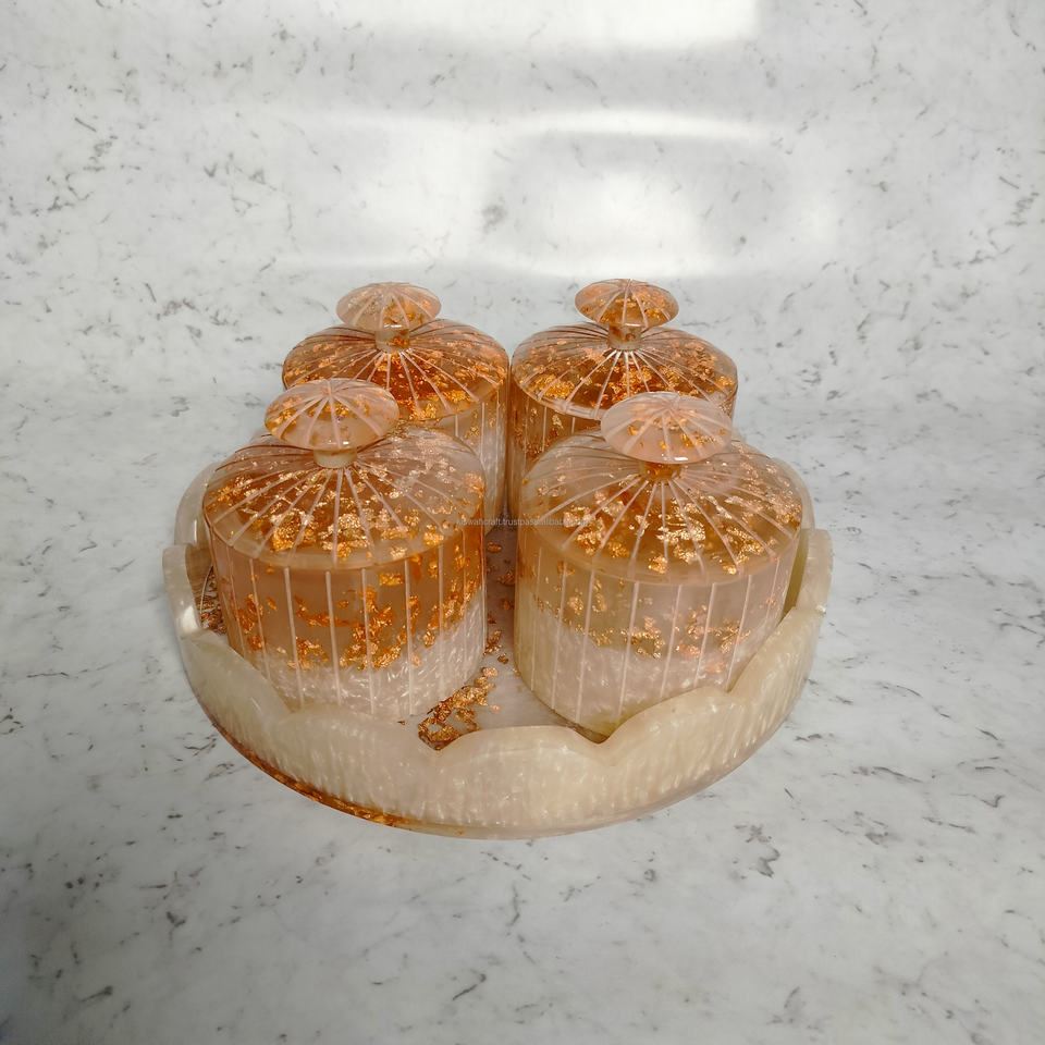Diseño moderno para juego de tarros de frutas secas Ramadan Eid Gift Bandeja de perlas de resina acrílica con tarro de acrílico Juego de 4 piezas de Kiswah Craft