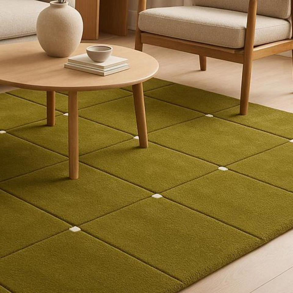 Alfombra Arquitectónica con Diseño de Cuadrícula, Color Verde Musgo, Hecha a Mano, con Relieve 3D, Patrón Geométrico Cuadrado, para Sala de Estar Moderna