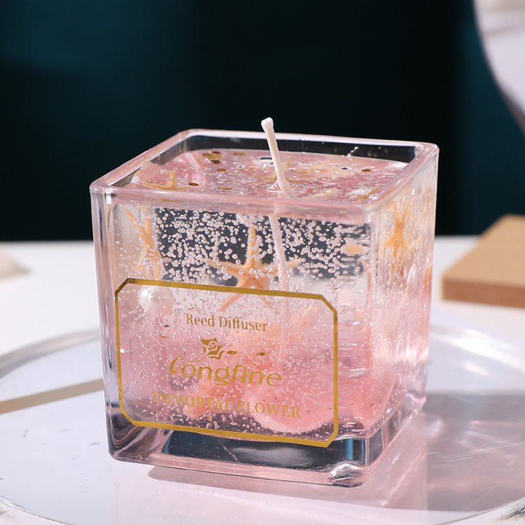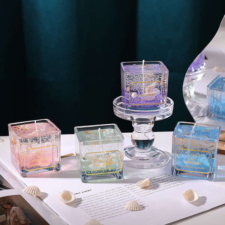 Vela perfumada de cera de gelatina de perla de concha Natural de aromaterapia con vidrio cuadrado transparente 300g 6x6cm