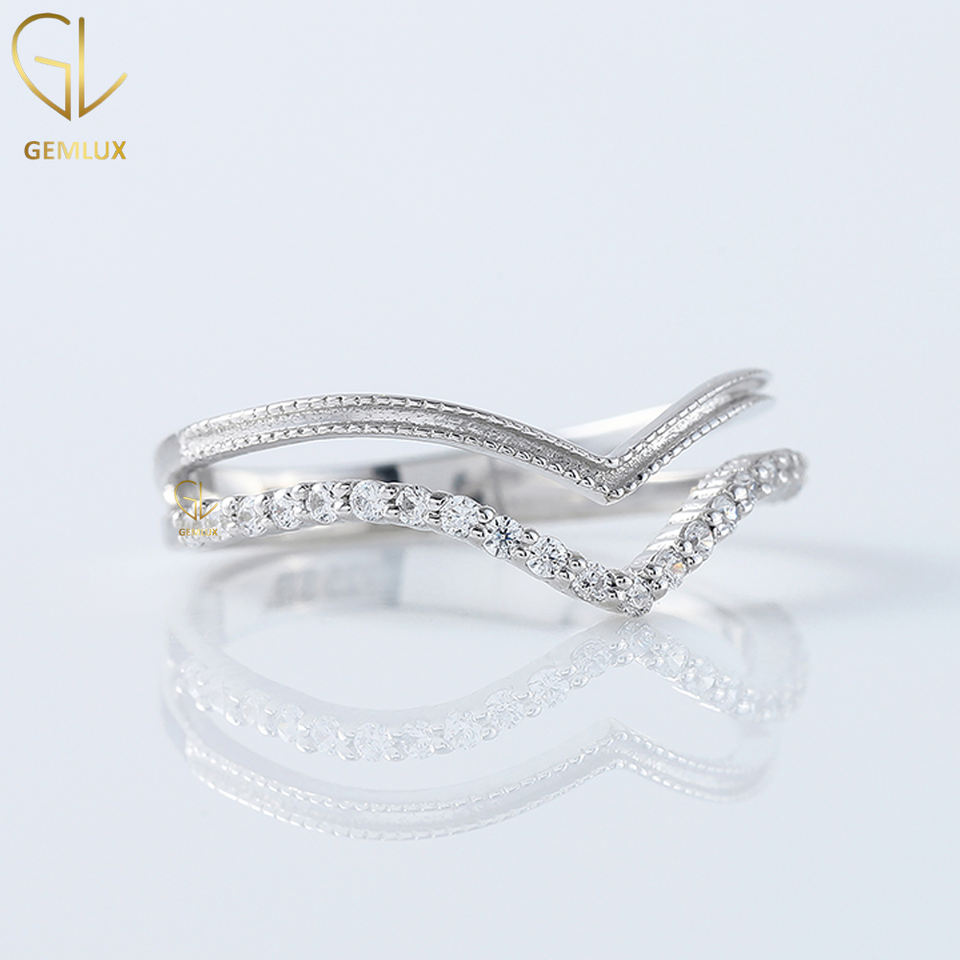 Anillo Art Deco, anillo de bodas curvo de moissanita redondo de doble fila, anillo Milgrain, anillo de oro blanco Chevron de 14K para mujer