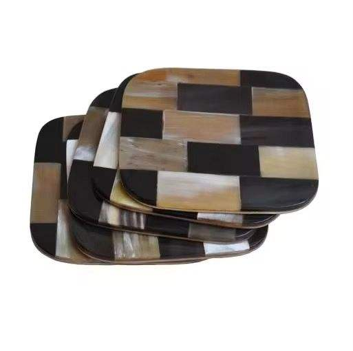 Juego de Cuatro Posavasos Artesanales Duraderos de Cuerno, Forma Cuadrada, Color Negro Beige, Estilo Clásico, Ecológicos, por Saniya Handicraft