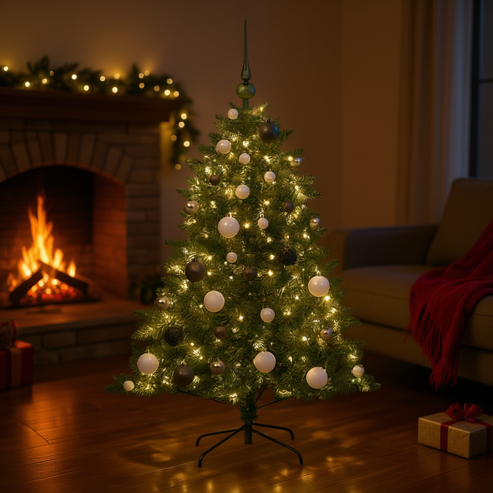 Árbol de Navidad Artificial Verde de 47.24 Pulgadas con 150 Luces LED Blanco Cálido, Decoración Festiva, Control Manual, Enchufe de Pared