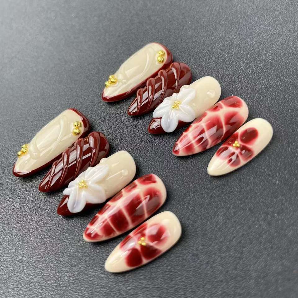 Uñas artificiales de alta calidad Color café flores talladas tridimensionales se pueden reutilizarprensa en uñas al por mayor