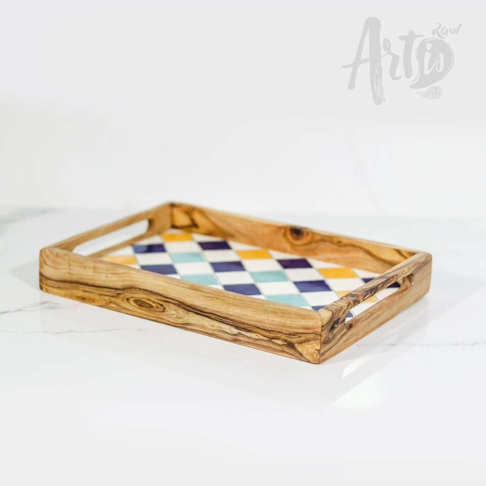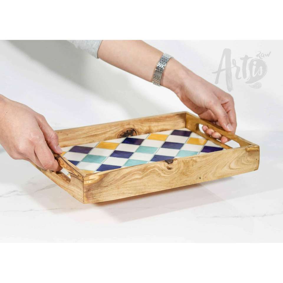 ArtisRaw-Bandeja para servir de madera de olivo hecha a mano con asas, azulejos de cerámica, Plato decorativo de madera para cocina rústica, TN