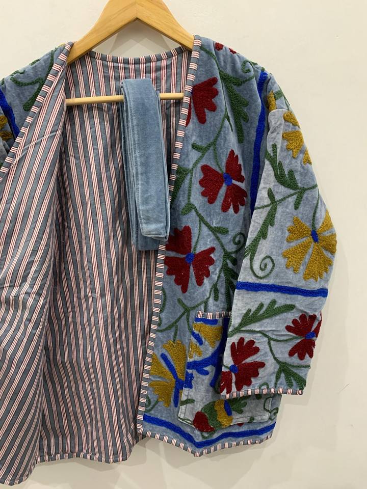 Chaqueta bordada Suzani artesanal, aspecto de terciopelo rico, abrigo bohemio Floral Multicolor, moda étnica de inspiración Vintage