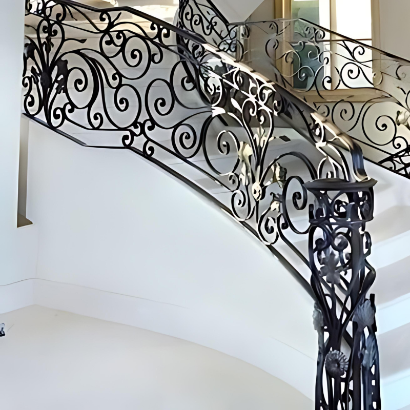 Barandilla de escalera de hierro interior artística con elementos decorativos forjados y acabado recubierto de polvo negro para seguridad de escaleras residenciales