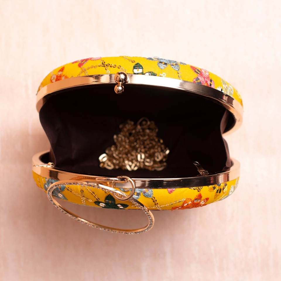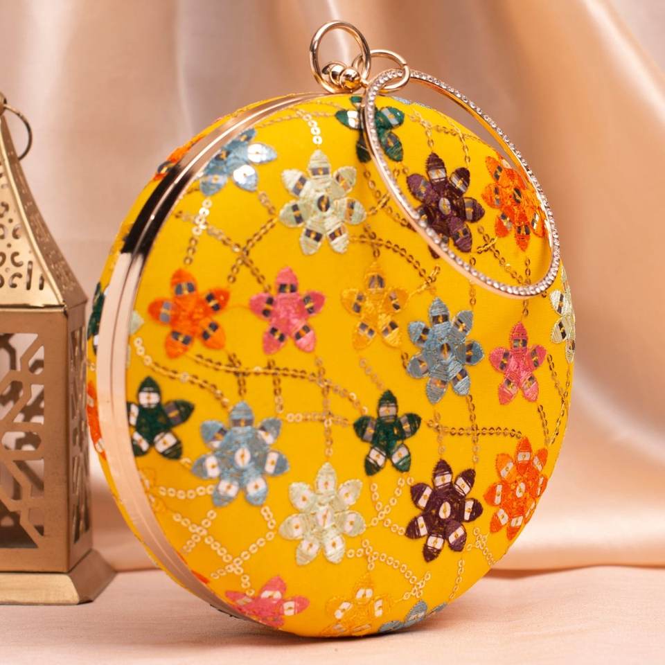 Bolso de mano Artklim con bordado de lentejuelas y hilo multicolor sobre base amarilla