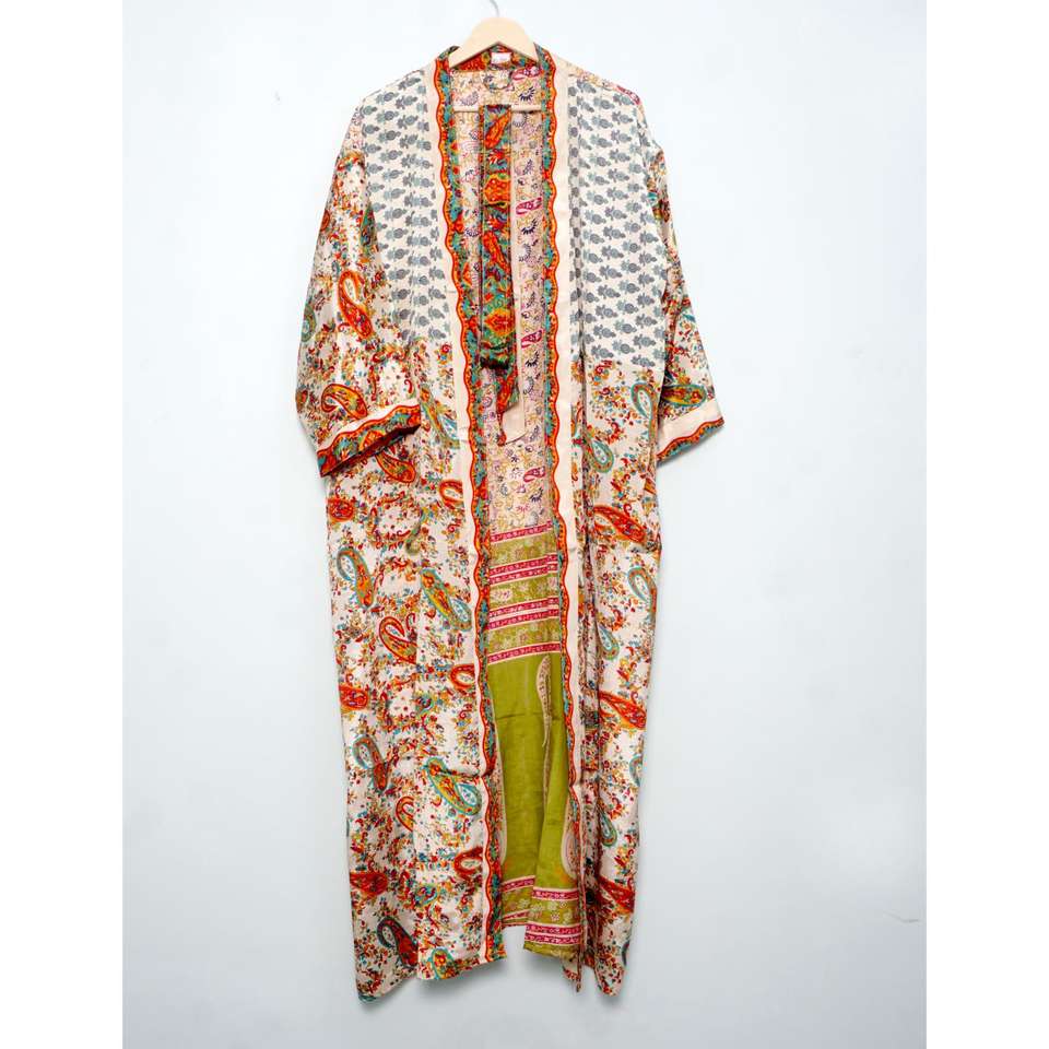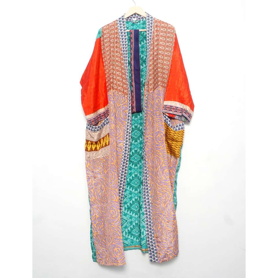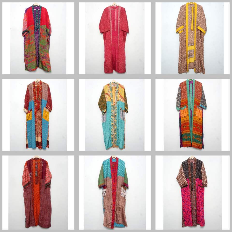 Albornoz de seda indio multicolor surtido, estilo kimono, Kantha, ropa de dormir al por mayor, vestido largo hecho a mano con patchwork