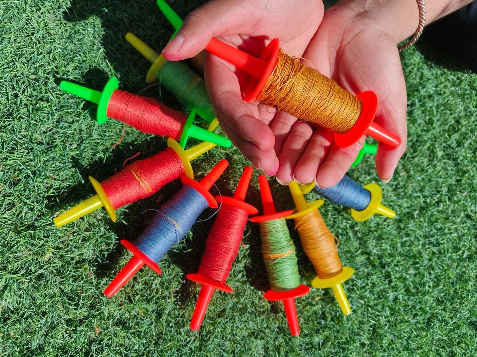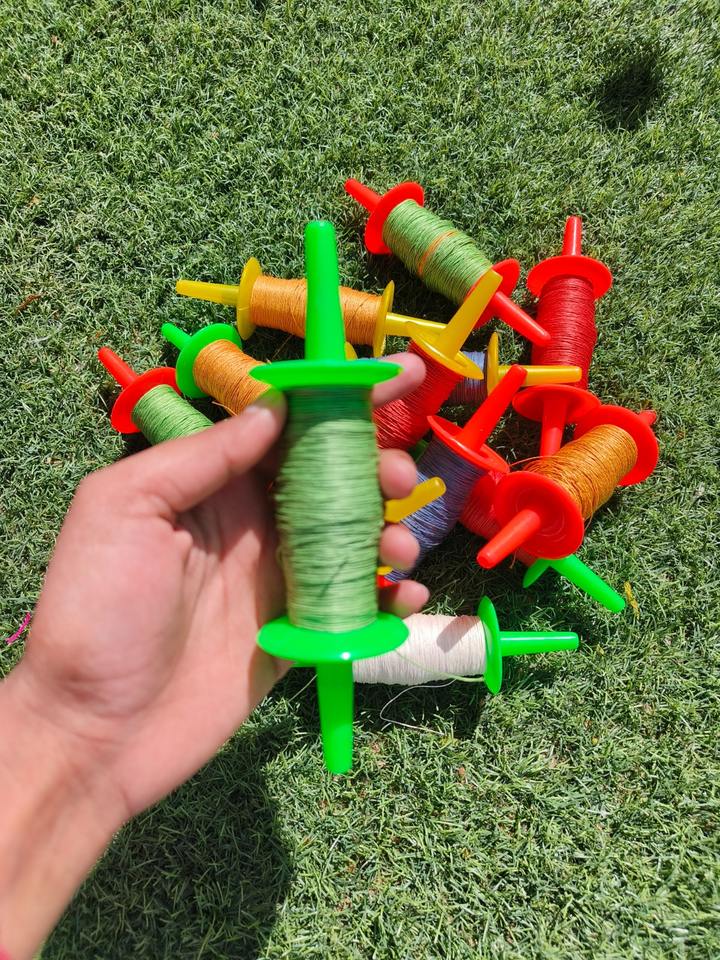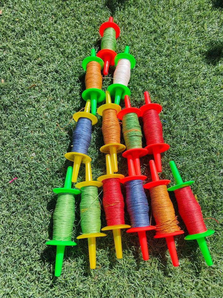 Surtido de carrete volador de cometa con campana para niños Firki Makar Sankranti decoración de fiesta de cumpleaños mango de hilo de algodón no dañino Charkhi