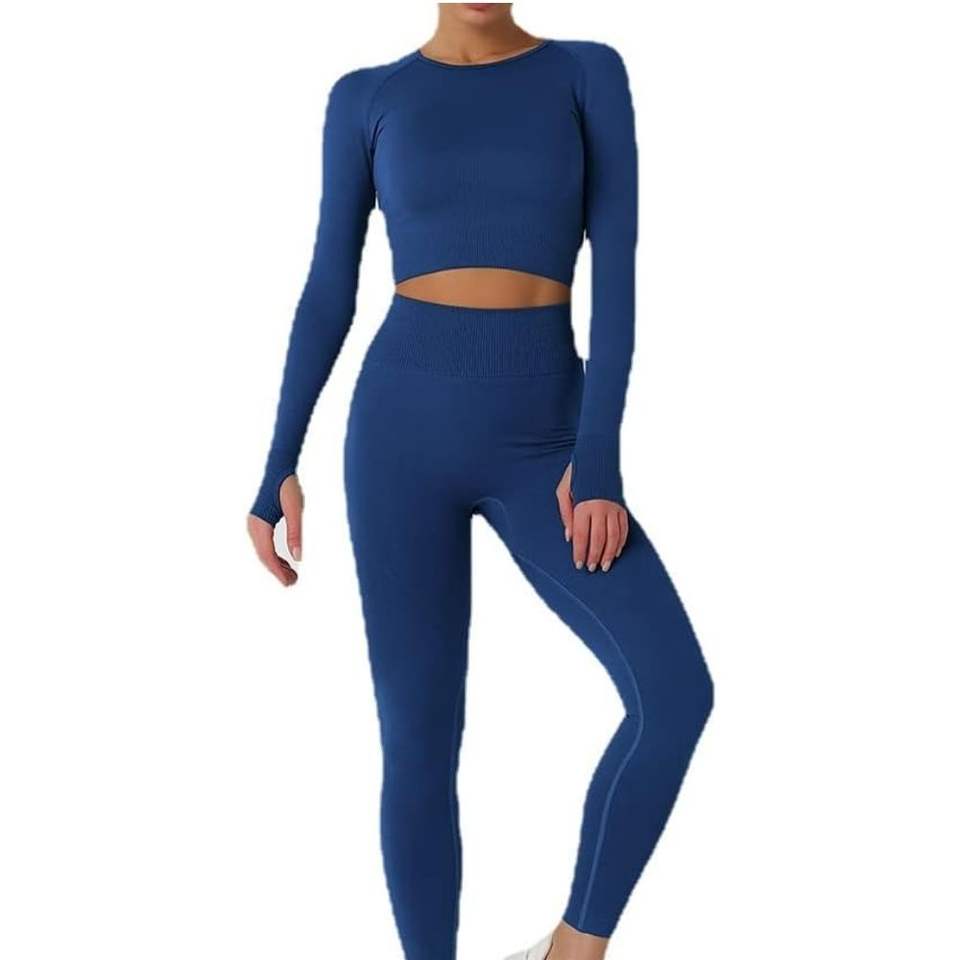 Conjunto Deportivo de 2 Piezas, Top de Manga Larga sin Costuras, Cintura Alta, Ropa Deportiva de Compresión, Azul Marino