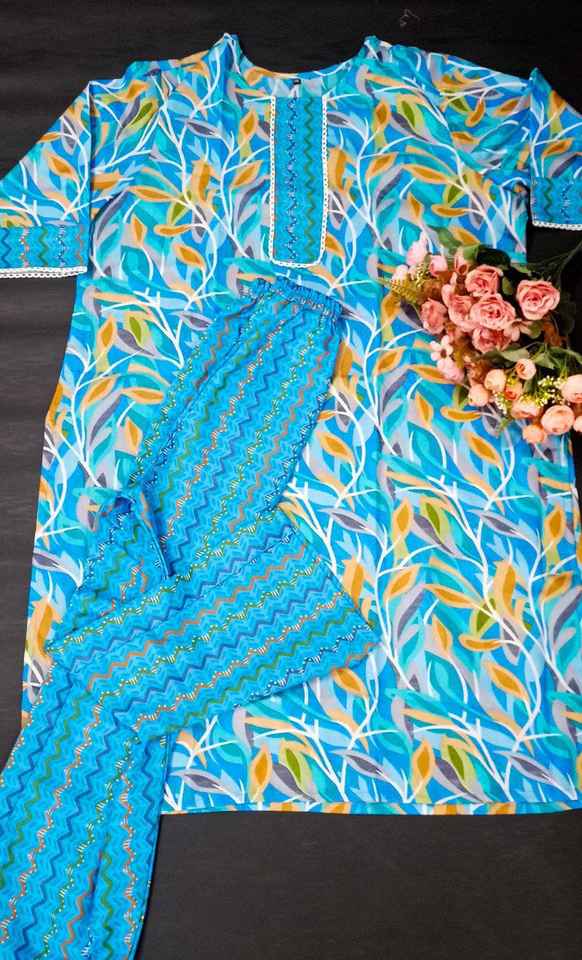 Directamente exportado desde la India Atractivo conjunto de pantalón Kurti de gasa a rayas de 3 piezas Trabajo de bordado de encaje para el uso diario de otoño
