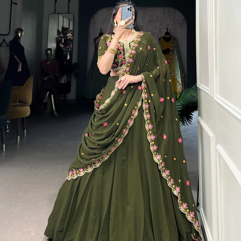 Atractivo diseño en color verde, vestido Lehenga Choli de alta calidad, elegante, tradicional, indio, étnico, para bodas y fiestas especiales.