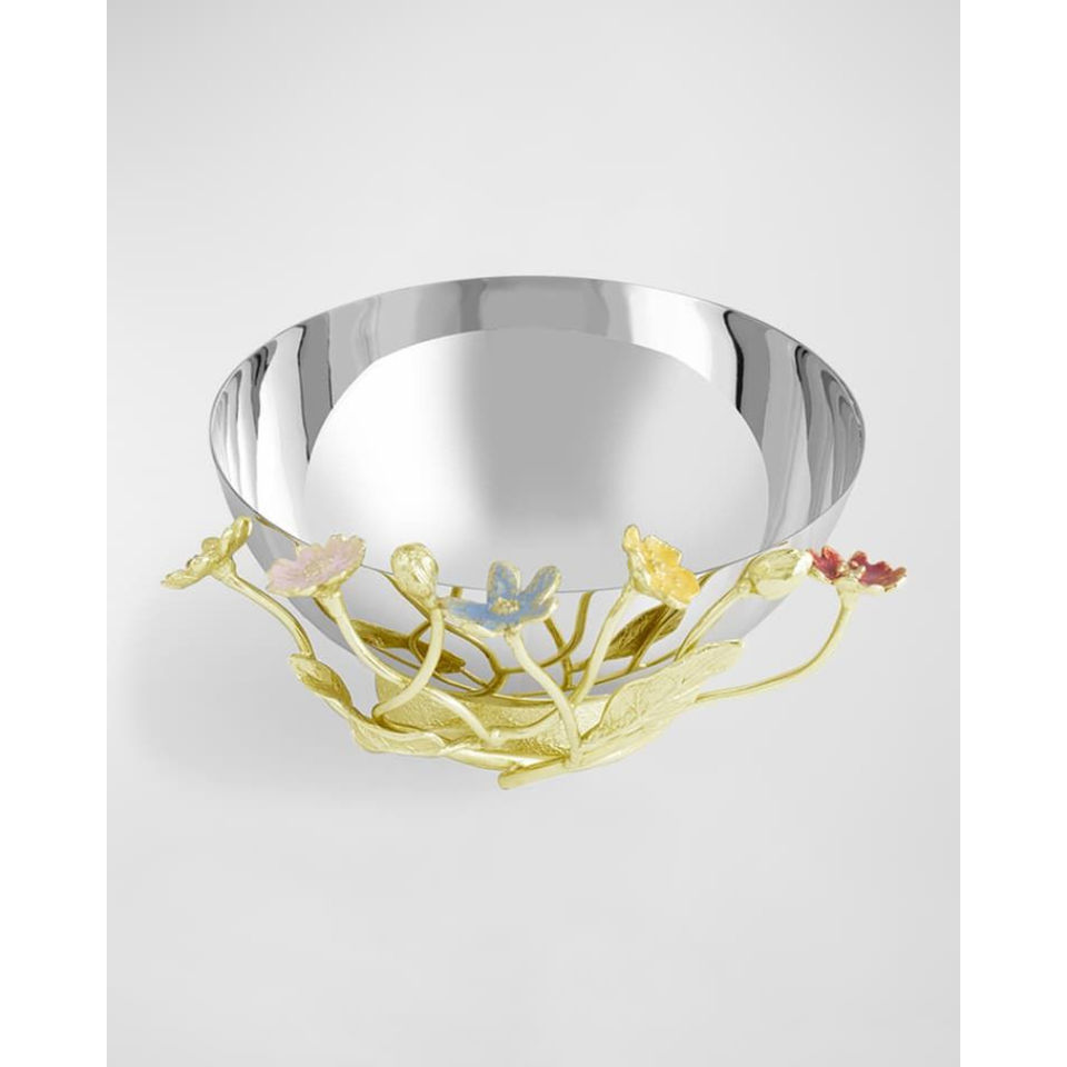 Atractivo Tazón Redondo de Acero Inoxidable Plateado Brillante para Servir Alimentos, Diseño de Flores Multicolores