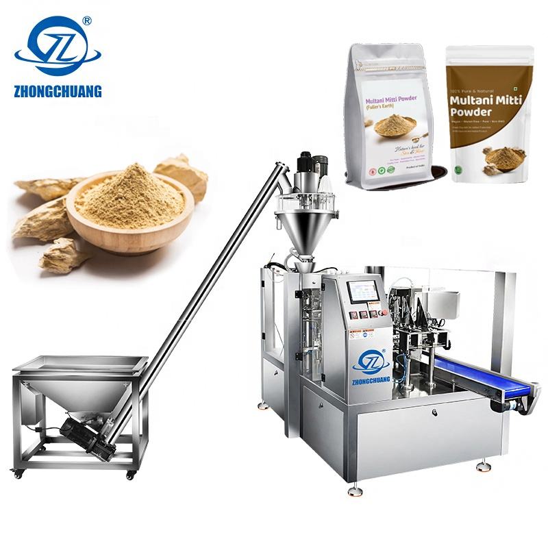 Máquina Envasadora Rotativa de Polvo de Cúrcuma y Multani Mitti con Sistema de Llenado por Auger para Bolsas Preformadas con Cierre Zip