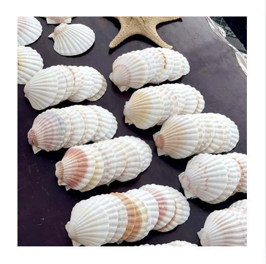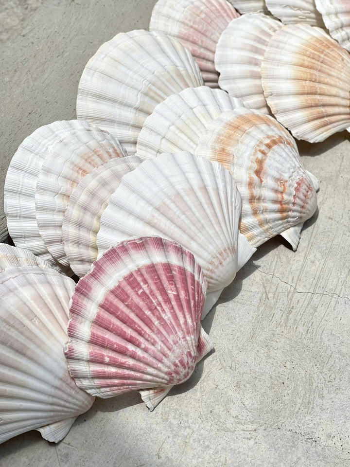 Auténticas conchas de vieiras de aguas profundas con texturas naturales para detalles sofisticados de bodas en la playa y decoración de mesas para invitados.
