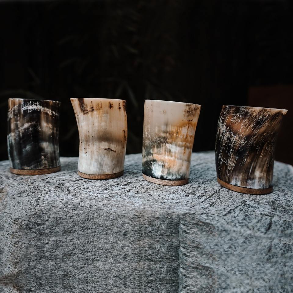 Vasos de cuerno auténticos hechos a mano con acabado liso y artesanía natural para fiestas temáticas vikingas y eventos históricos.
