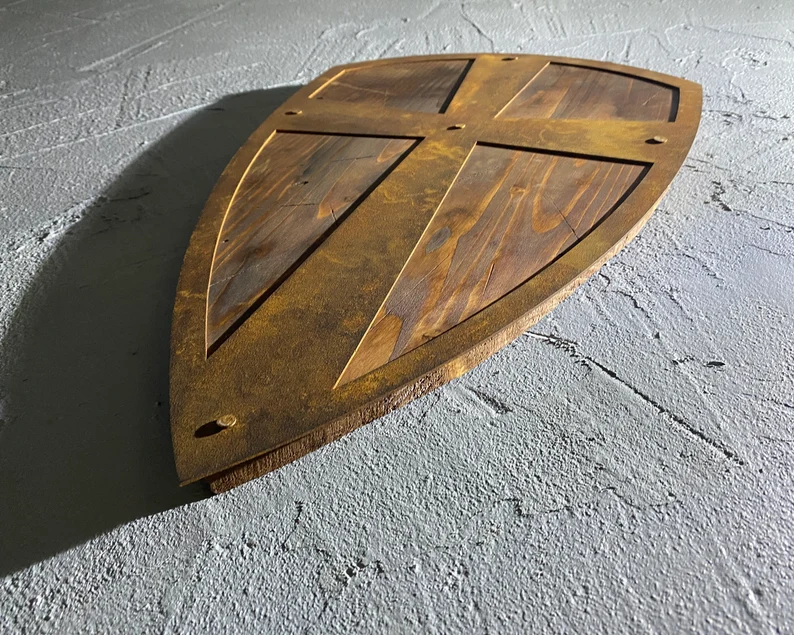 Auténtico escudo de madera medieval decoración de pared Escudo de caballero hecho a mano para decoración rústica del hogar.