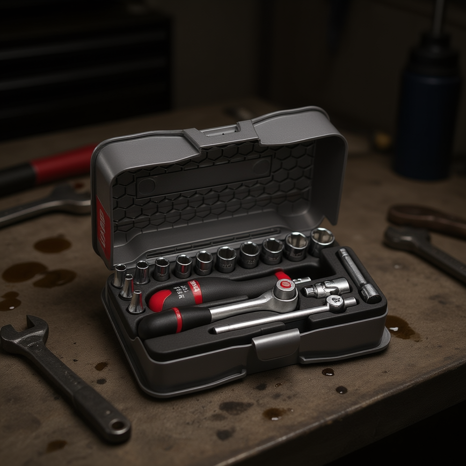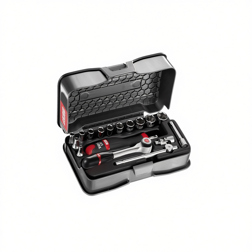 Juego de Herramientas para Reparación de Automóviles con 17 Piezas, Llave de Trinquete de 1/4'' y Vasos Hexagonales en Estuche de ABS