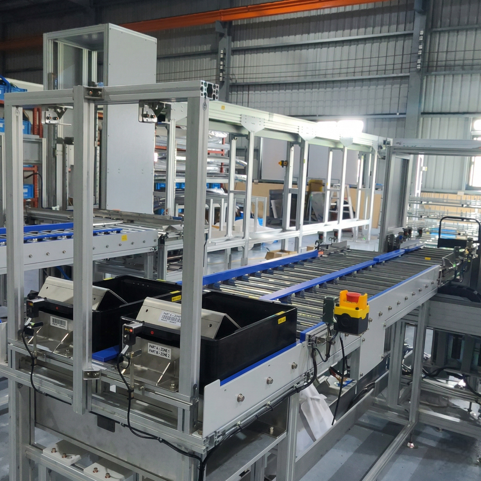 Aplicación:Transportador de rodillos con posicionamiento/desplazamiento de producto personalizable