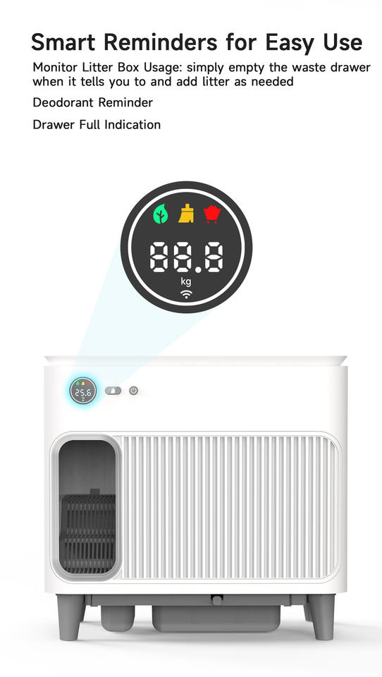 Control de olores, Cómodo, Respetuoso del medio ambiente, Fácil de limpiar, Gran capacidad, Limpieza automática, Totalmente cerrado, Libre de polvo, desodorizante, monitoreo inteligente