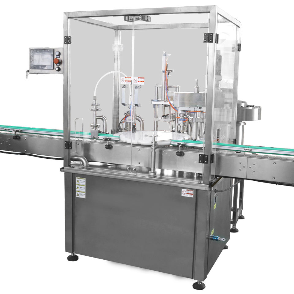 Línea de llenado de líquido automática de 10ml-100ml, máquina taponadora de llenado de aceite de glicerina vegetal para bebidas de botellas de vidrio Chubby Gorilla
