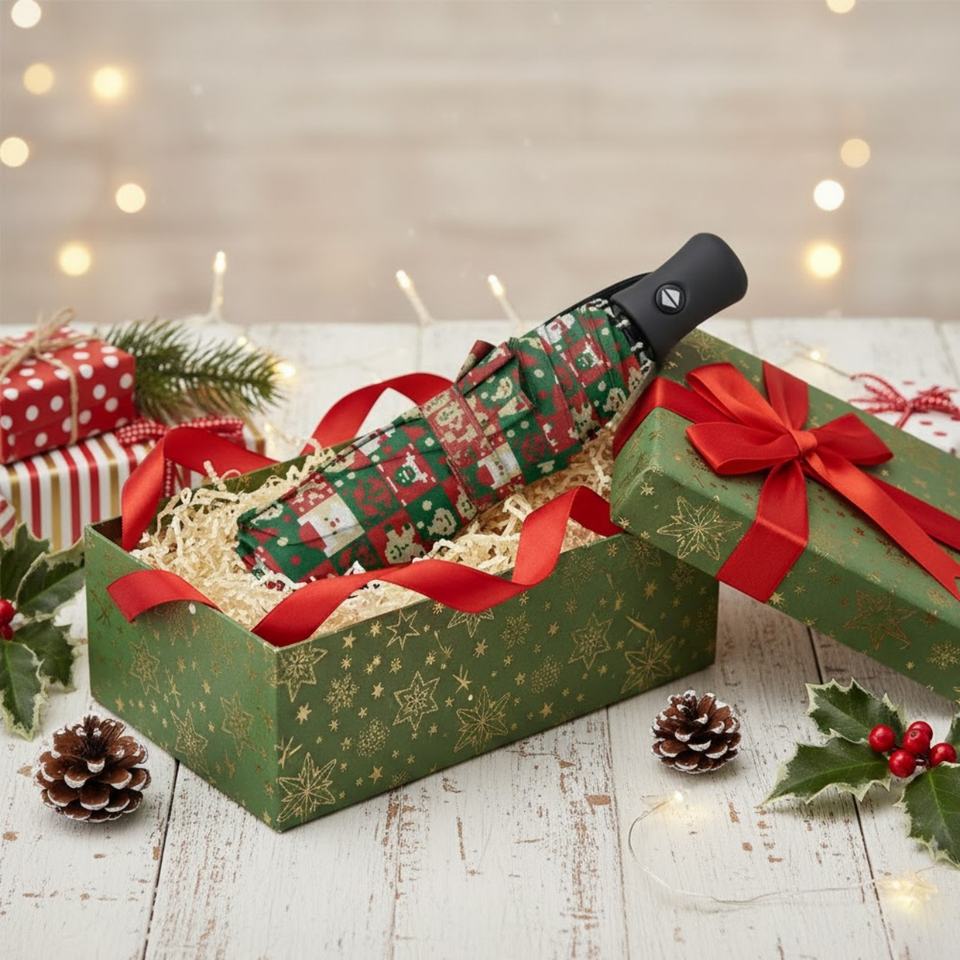 Paraguas Plegable Navideño con Armazón de Hierro, Apertura y Cierre Automáticos, Resistente al Viento, Compacto y Ligero, para Uso Diario, Oficina, Viajes, Escuela y Caminatas