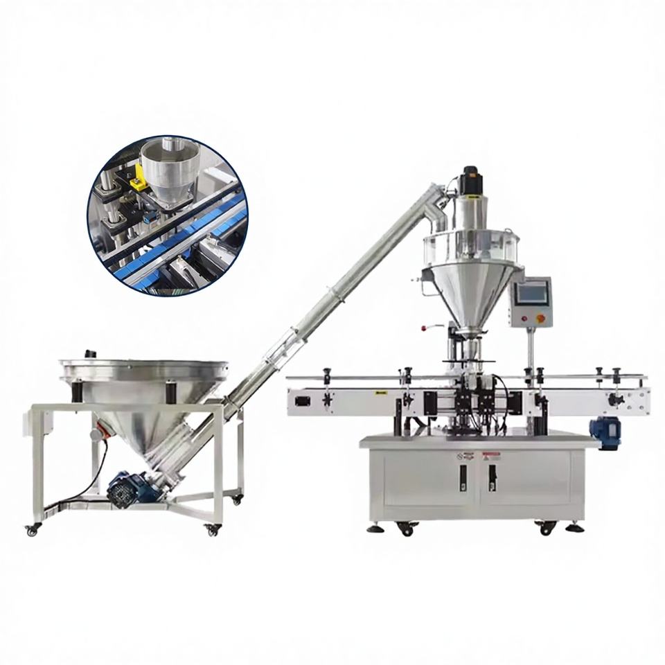 Línea de Llenado de Polvo Eléctrica Semiautomática con Dosificador de Tornillo Servo, Codificador de Fecha y Controlador de Peso para Alimentos, Proteínas, Botellas y Latas