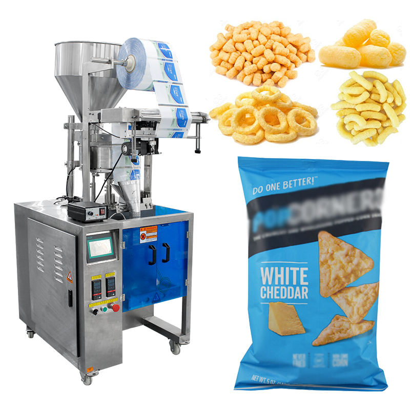Máquina automática vertical pequeña para llenado y envasado con nitrógeno de snacks: alimentos inflados, palomitas y patatas fritas