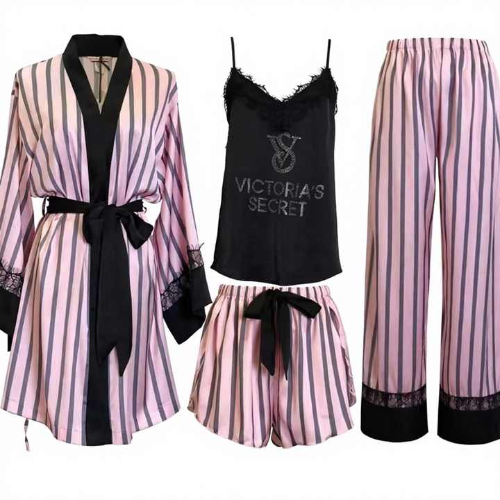 Pijama largo de otoño para mujer para comercio exterior, lujo en poliéster 'ice silk', estilo Women's Secret, con incrustaciones brillantes, rayas y encaje a juego de colores