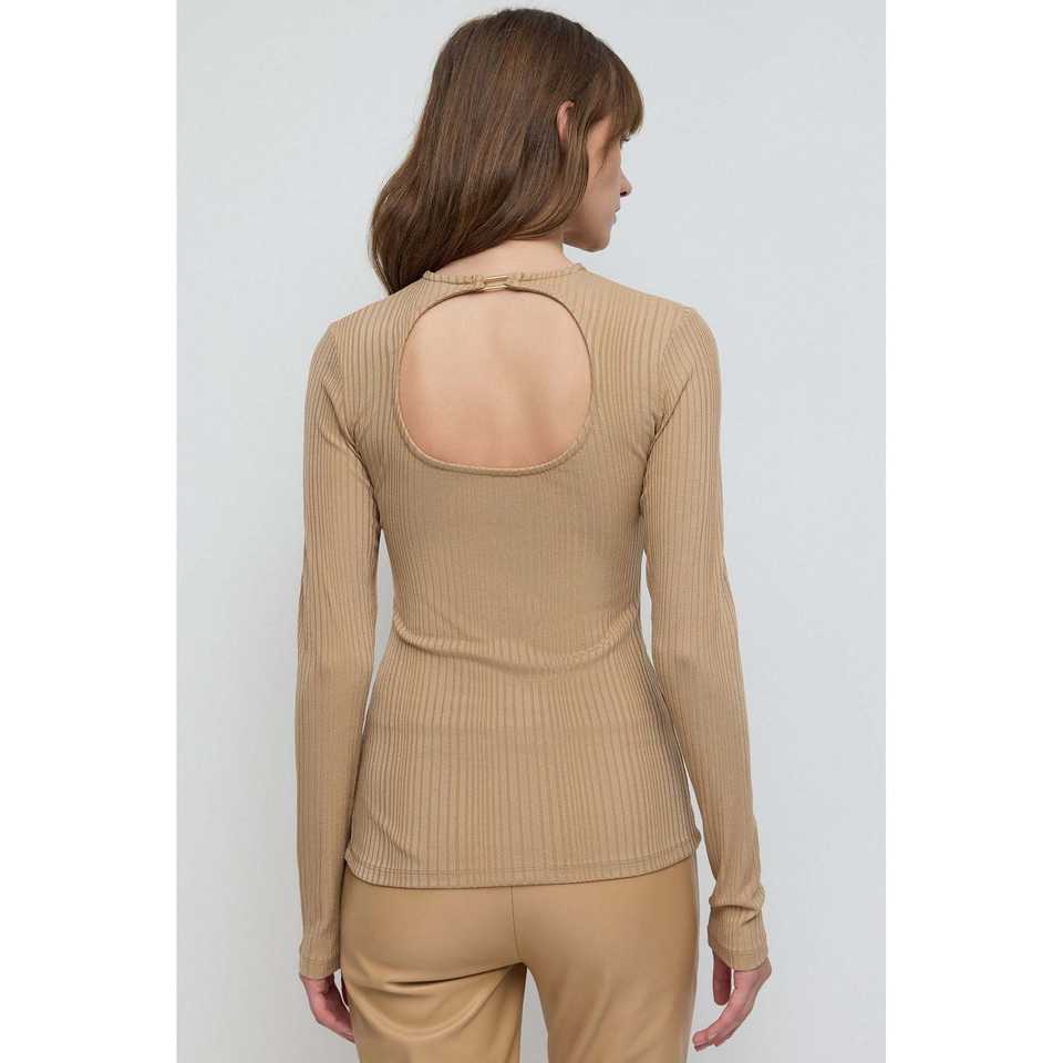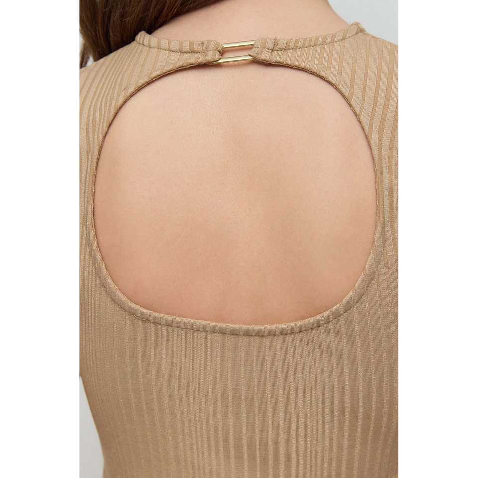 Blusa Casual de Otoño-Primavera con Cuello Redondo, Manga Corta, Acanalada, Espalda Descubierta, Detalle de Hebilla en la Parte Delantera, Talla XL