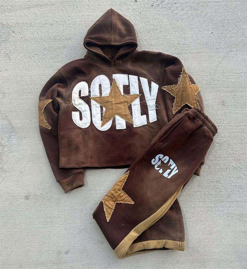 Conjunto de Ropa Deportiva de Dos Piezas con Logotipo de Parche Bordado Personalizado de Forro Polar Vintage Otoñal, Pantalones Deportivos y Sudadera con Capucha para Hombre