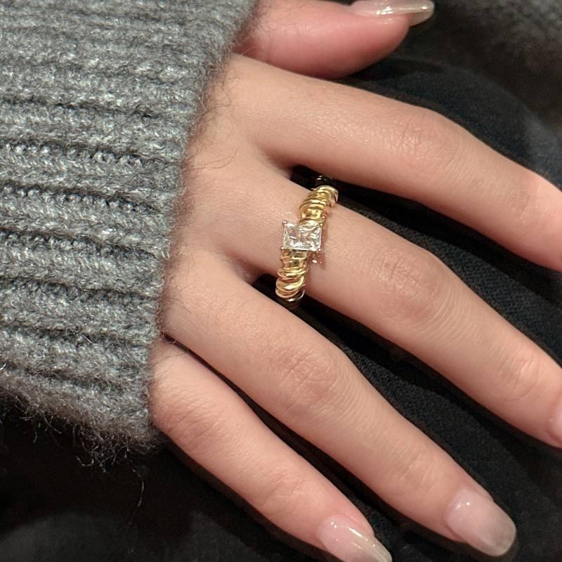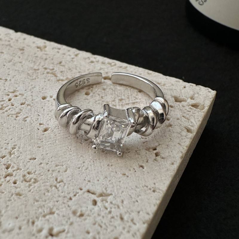 Anillo de Lujo Otoño Invierno, Plata de Ley S925 con Patrón Retro Francés, Diseño Cuadrado Simple con Incrustaciones de Circonita, Ajuste Abierto