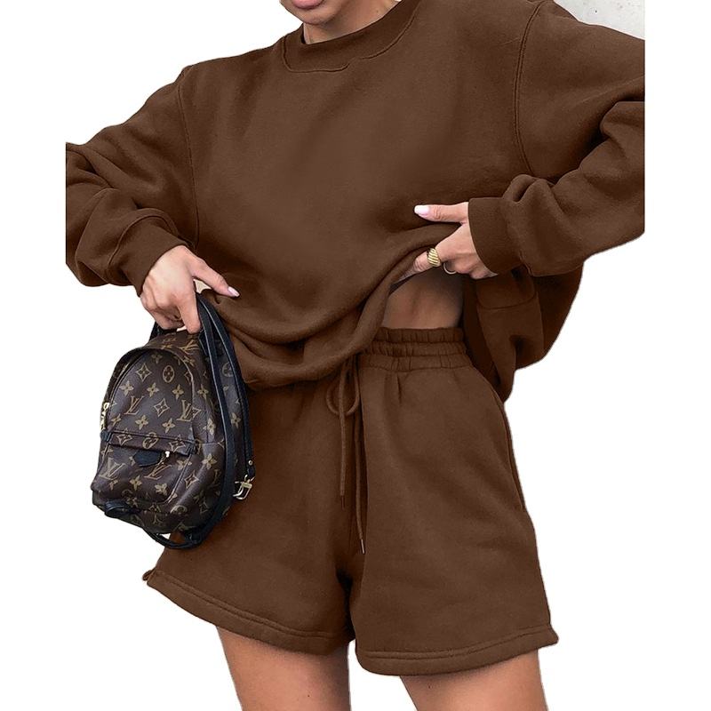 Otoño Invierno Color sólido nuevo cuello redondo algodón rosa señoras Jumper sudaderas con capucha conjunto de gran tamaño mujeres 2 piezas pantalones cortos Set2026