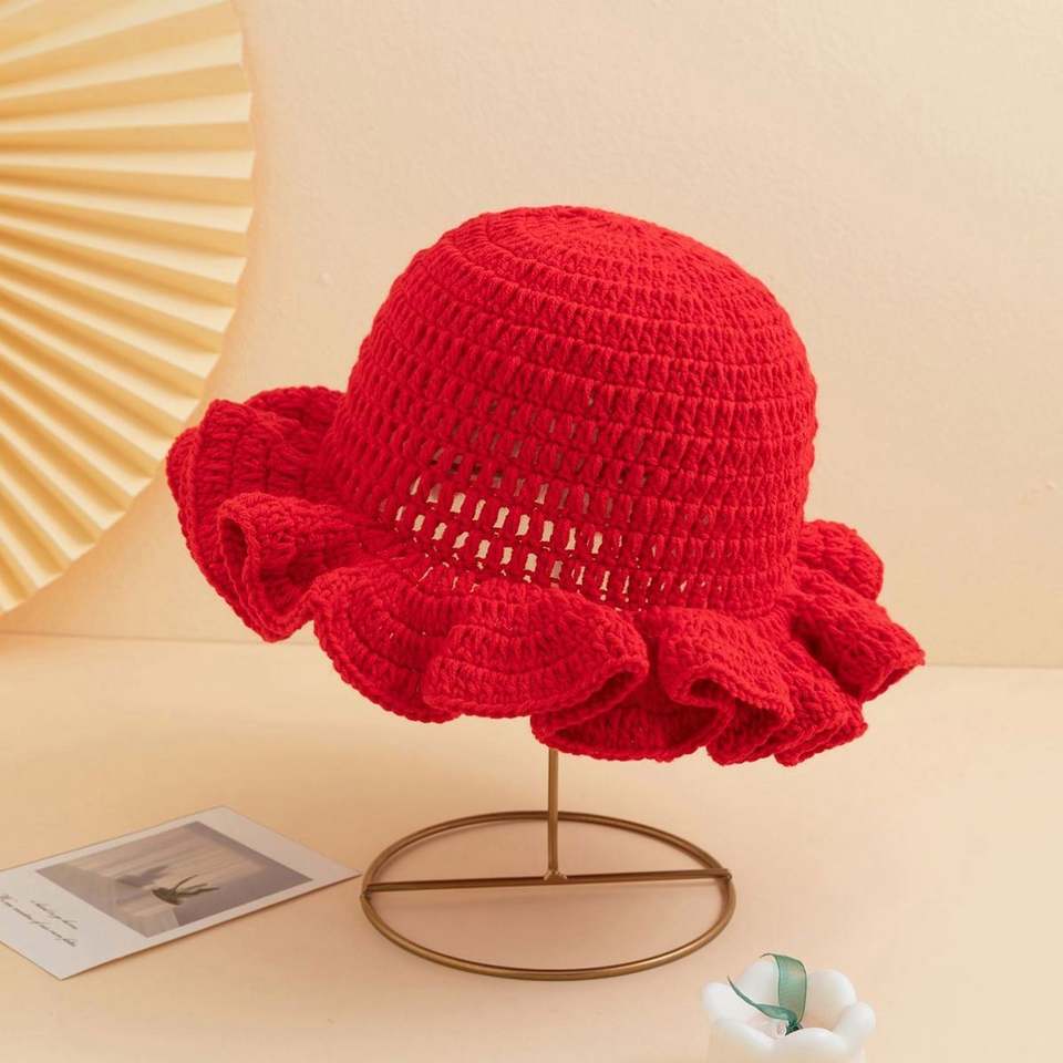 Gorro de Pescador de Lana Tejido a Crochet, Color Sólido, con Borde Rizado, para Otoño e Invierno