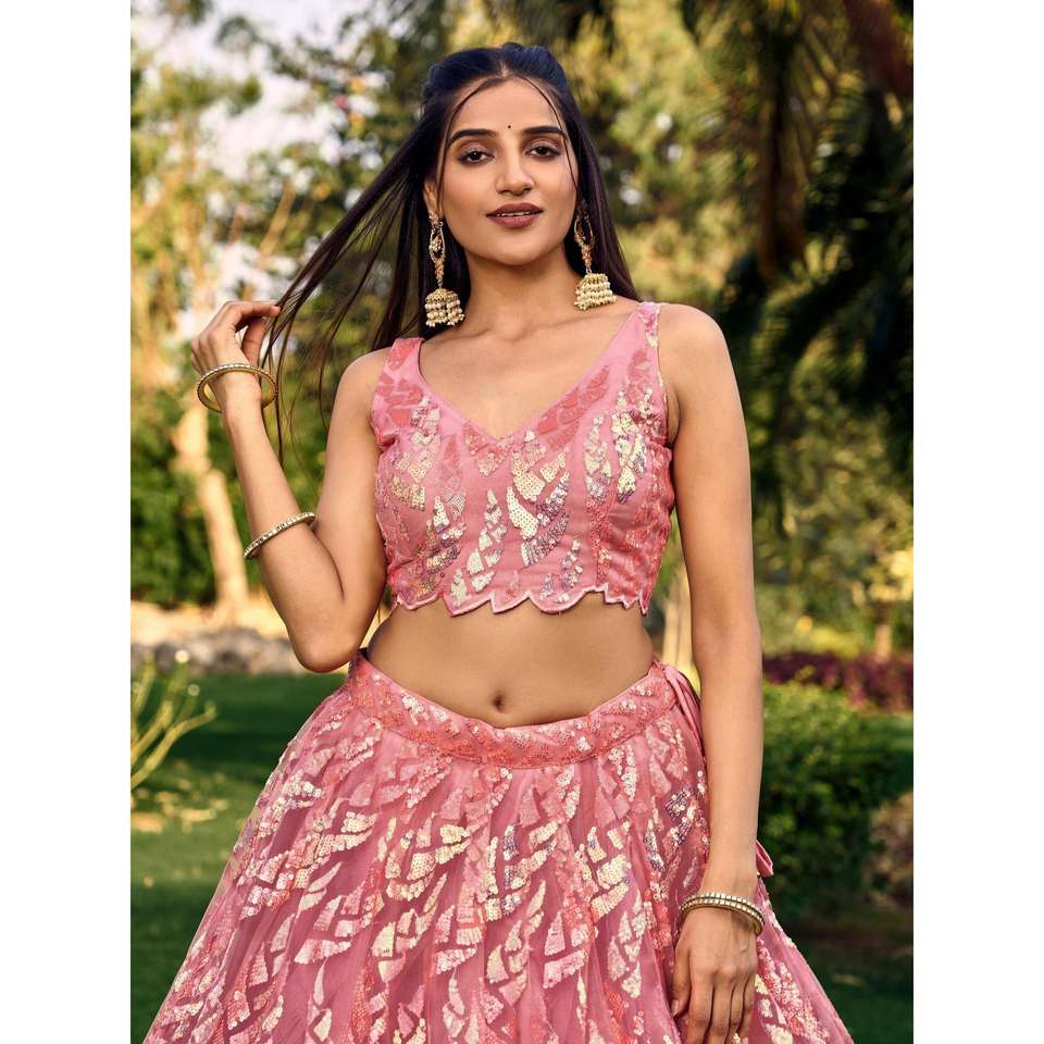 Impresionante Red De Lentejuelas Rosa Dama De Honor Lehenga Choli Con Dupatta
