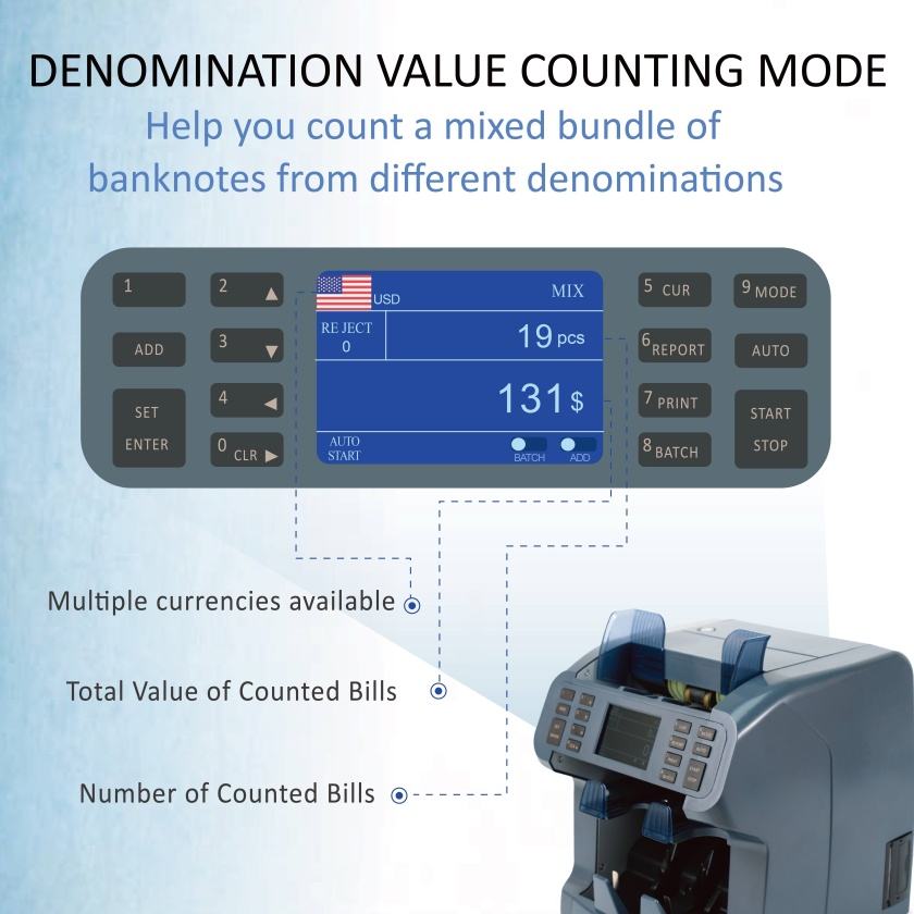 Contador de Billetes Portátil BC-8900 con 2 Compartimentos, Pantalla LED TFT, Reconocimiento Automático de Monedas USD/EUR/CAD, Grado Bancario