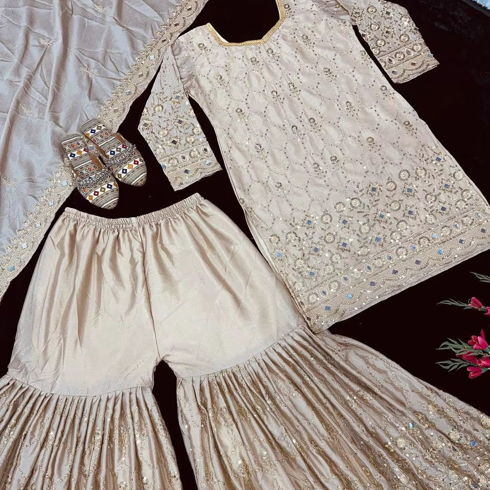 PRECIOSO VESTIDO DE FIESTA TOP Y PLAZZO. CON FANCY DUPPATA