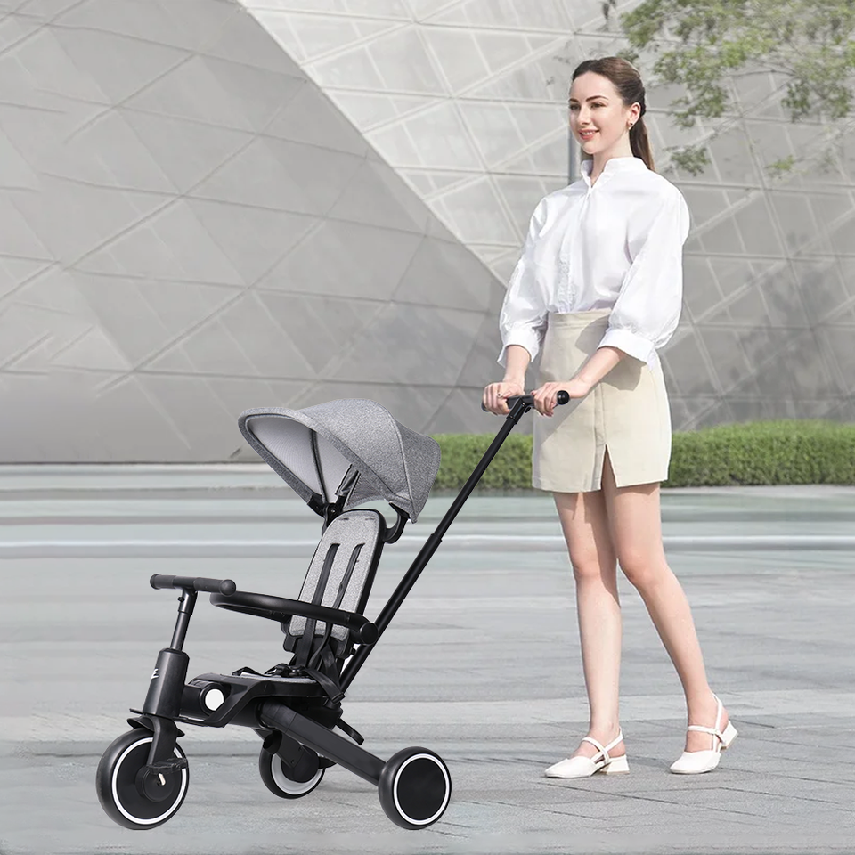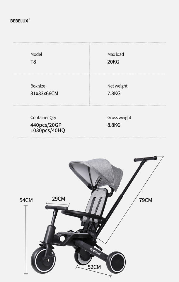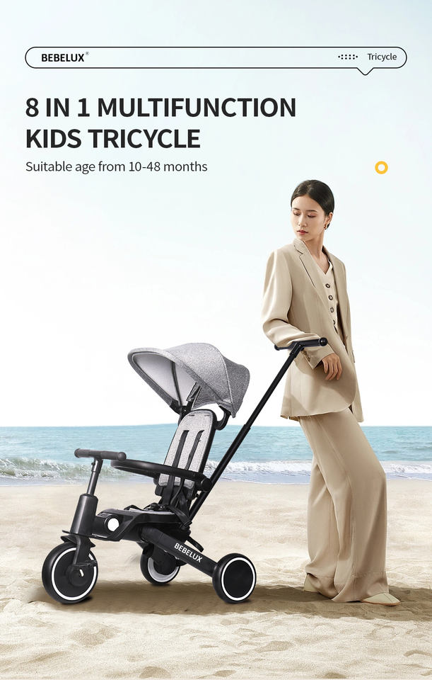 Triciclo Multifuncional para Bebés BEBELUX T8 con Respaldo Reclinable Plegable con un Solo Botón y Asiento Giratorio para Niños Pequeños
