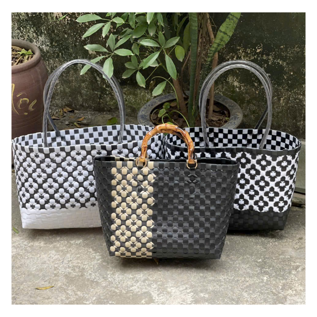 BOLSO DE MANO DE PLÁSTICO TEJIDO A MANO CON CORREA DE PP, MÁS VENDIDO, DE LUJO, IMPERMEABLE, ECOLÓGICO, CON FORRO DE SEDA, HECHO EN VIETNAM, TAMAÑO PERSONALIZADO