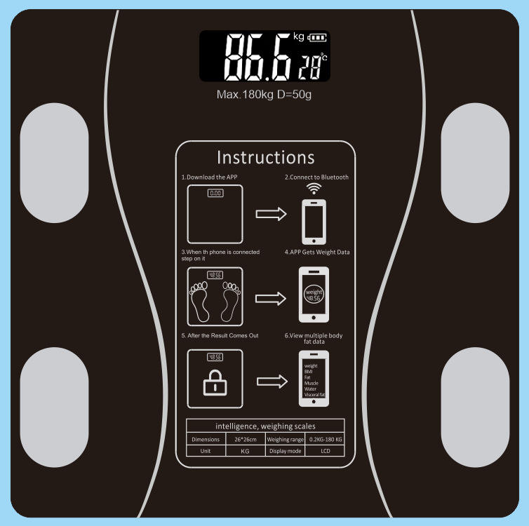 Medidor de calorías, IMC masa muscular, masa ósea, proteína, Contenedor medidor de agua, Metabolismo basal, grasa visceral, Bluetooth, Medición de grasa, Medición de peso, Prueba de contenido de grasa corporal y aguaFunción