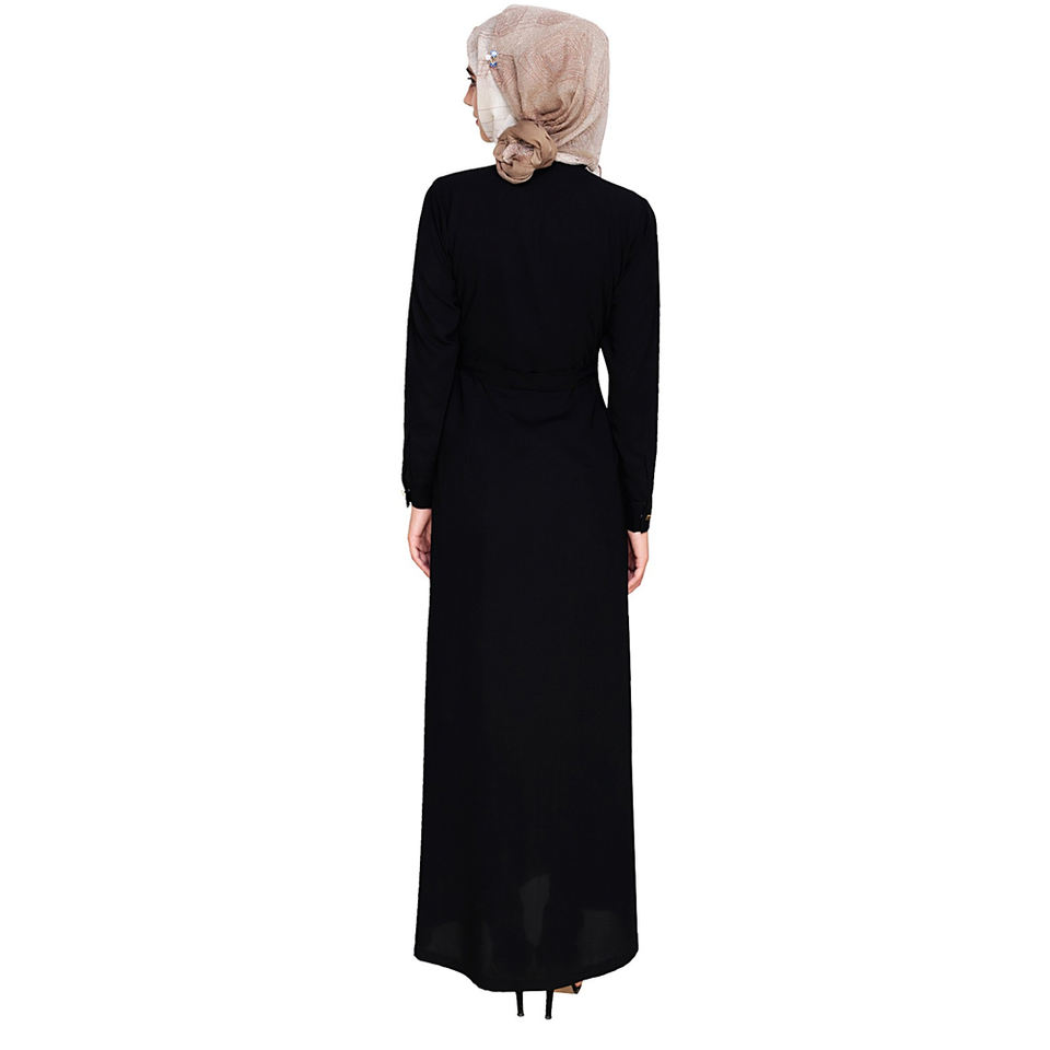 Abaya-Abaya negra con cremalleras metálicas en la parte delantera, Cinturón fino con tachuelas en mangas
