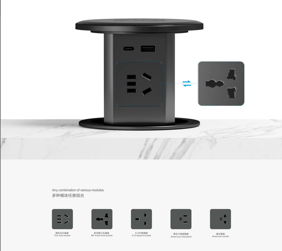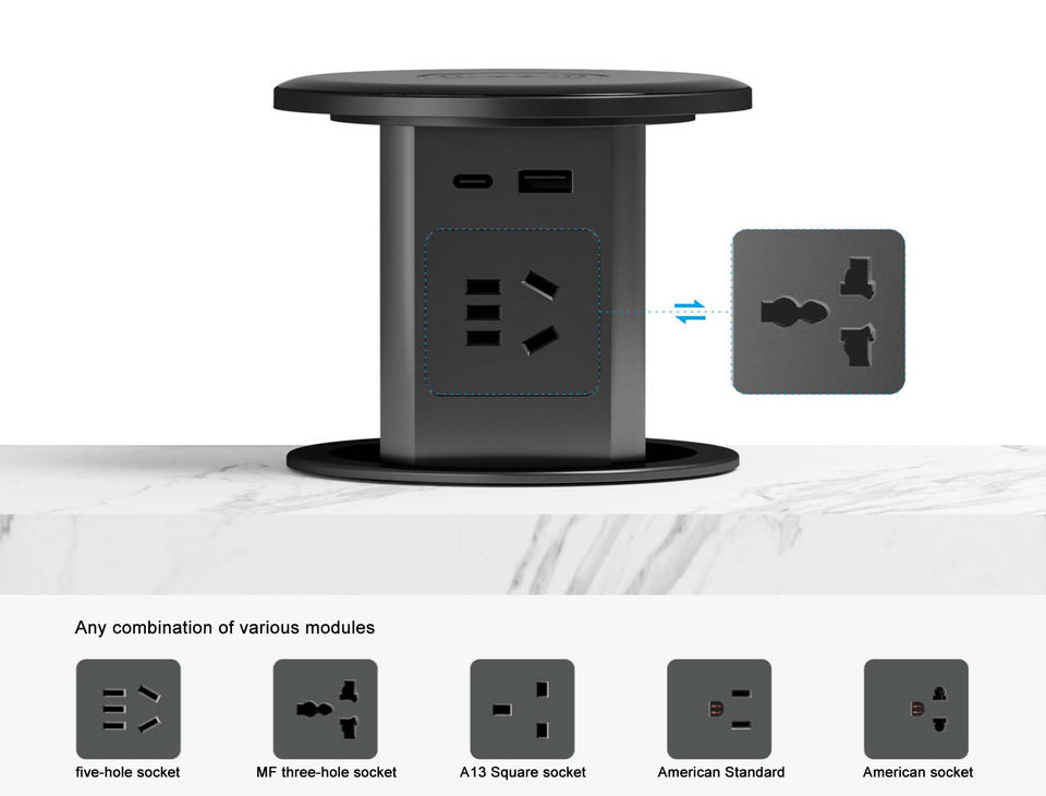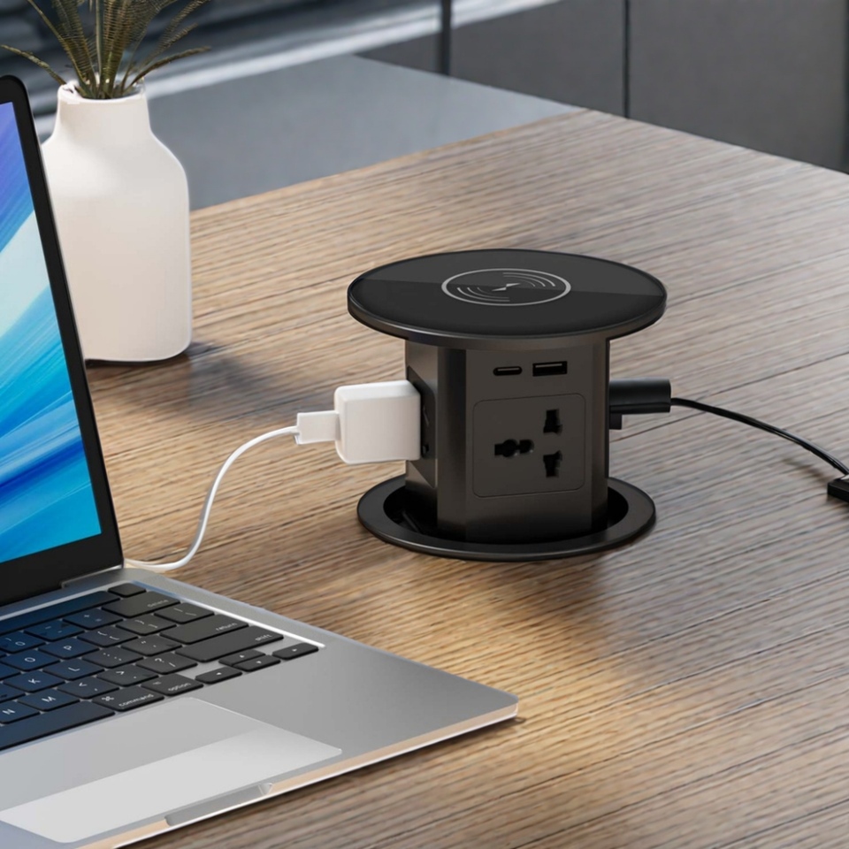 Enchufe Eléctrico Retráctil Automático BNT, Oculto y Empotrado, con Cargador Inalámbrico, 4 Enchufes EU + Puerto USB A+C para Oficina